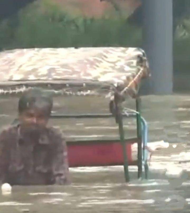 有当地人发布的视频显示新德里的标志性建筑群红堡周边道路已被完全淹没,有三轮车夫骑行在齐胸深的水中,路上的货车与公交车都只剩了个车顶在水面上,可见某些地方的积水是很深的。