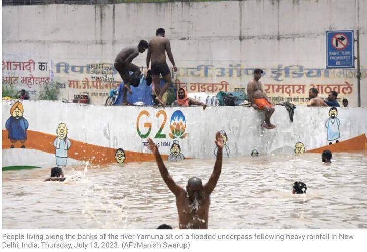 报道称新德里多地出现严重积水,市内多个区域一片汪洋,就连地铁运行也受到了影响(报道未明说,推测很可能是地铁进水),地势较高的拉杰卡德的甘地陵周围的道路也被淹没,河水也流入了这片陵地,据说市区内涝严重的地方有数万人不得不撤离。