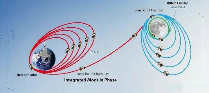 该推进器上携带了超过一吨的燃料,将通过5次加速变轨,把探测器的远地点送到38万公里外,然后依靠恰好正在那里的月球的引力将其捕获,进而泊入月球轨道,然后再通过5次的减速变轨动作,才能进入月面以上100公里的环月轨道中等待降落。