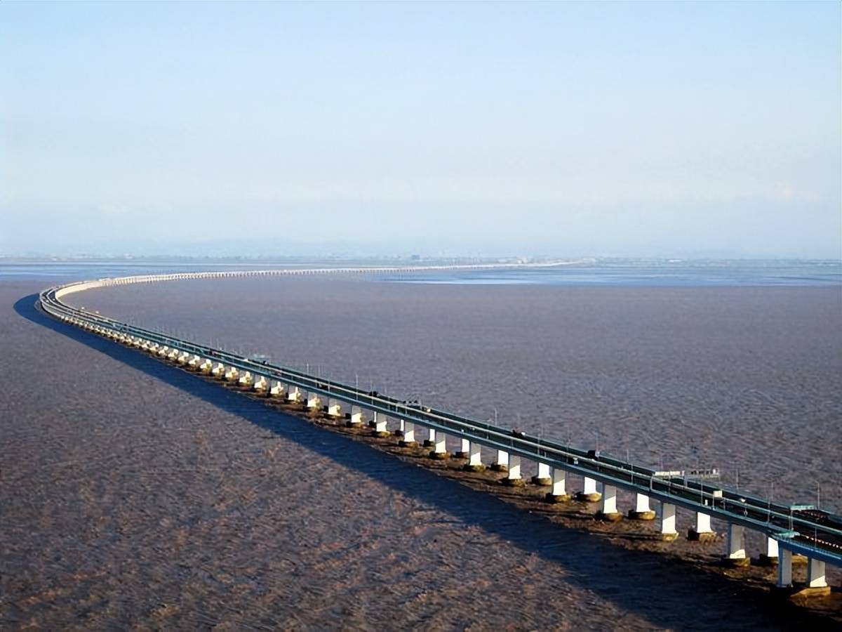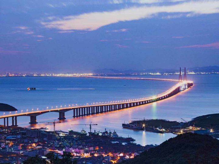 第六:杭州湾跨海大桥。我国杭州湾跨海大桥北起浙江省嘉兴市海盐郑家埭,南至宁波市慈溪水路湾,大桥在杭州湾中间有一个面积达1.2万平方米的海中平台,起到高速交通服务区和观光的作用。该桥线路全长36千米,海中桥梁总长35.7千米,于2008年5月1日正式通车。跨海部分长度不下于港珠澳大桥。