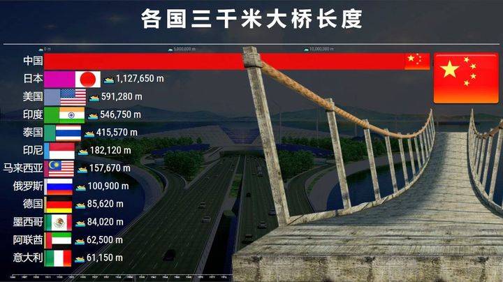 说到造桥,如今全球已经没有任何一个国家可以在规模和技术上和我国相比,看一看世界各类桥梁的排名就知道了。下图为2020年时全球各国的桥梁总长度排名前10的国家和其长度数据。