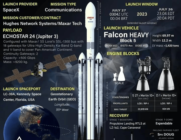 北京时间2023年7月29日早上11:04,猎鹰重型(FH)火箭在美国佛罗里达州的NASA肯尼迪航天中心发射升空,上面搭载着人类航天史上最大最重的地球同步轨道商业通信卫星“木星三号(Jupiter 3)”,其重量高达9.2吨(一说10.1吨),为有史以来人类制造的重量最大的卫星。
