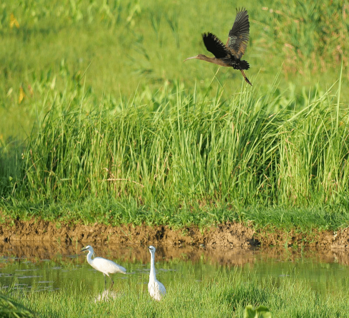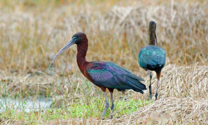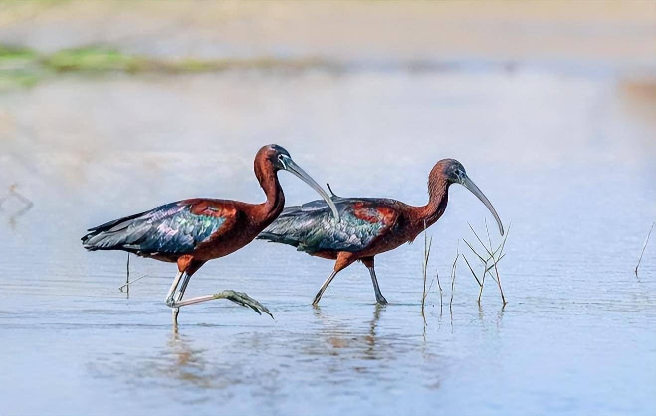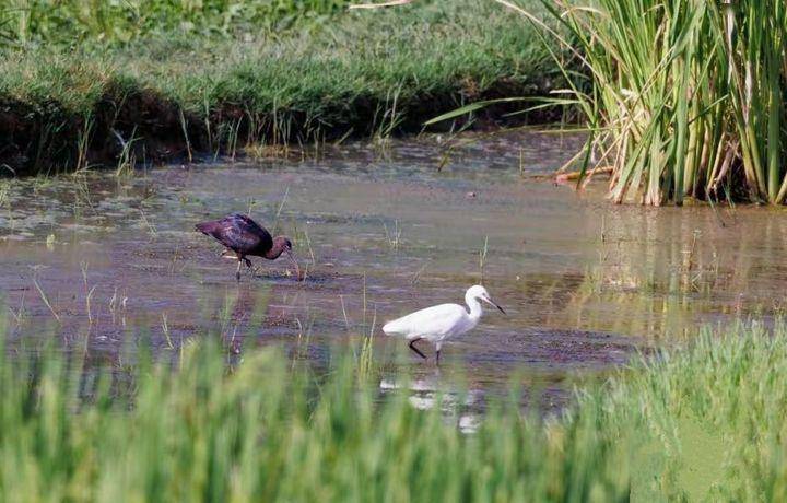 鹮科鸟类和鹭科鸟类很相似,都有着大长腿和大长嘴,两者都属于涉禽,只是鹮科鸟类相对体型较小,下图中就是彩鹮和白鹭在梁平双桂湖湿地公园一起觅食的情景。