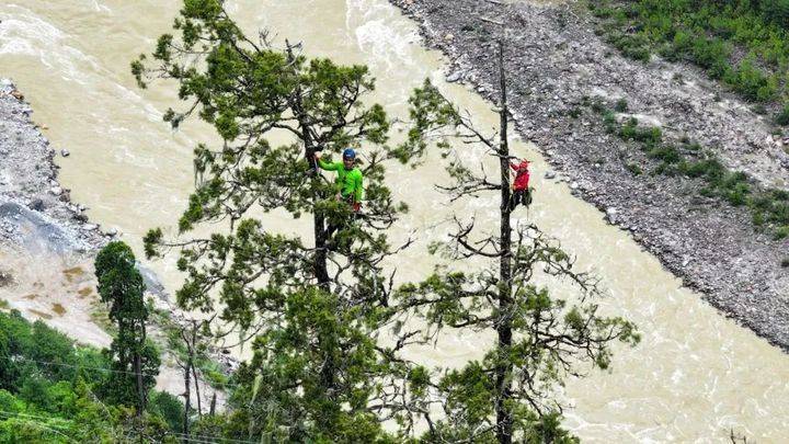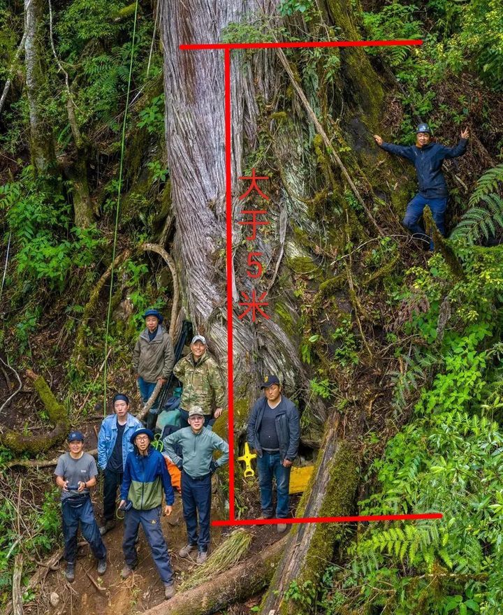 这一发现迅速引起了我国更多的植物科考和保护相关单位的兴趣,于是在2023年6月7日到6月23日,中国科学院植物研究所、福建农林大学、厦门大学、中国野生动物保护协会、上海辰山植物园等以及西藏本地一些相关单位组成了中国巨树科考队,前往林芝市波密县易贡乡等地,耗时半个多月完成了藏南柏木巨树群落的综合科考任务,并以人工攀树吊尺测量的传统测量方法重新量出了这棵巨树的高度,给出了该树的活体高度为101.2米,树龄大致为1450岁,并将其命名为藏南柏木Ⅰ号。来看看本次拍摄的这棵巨树的等身照。