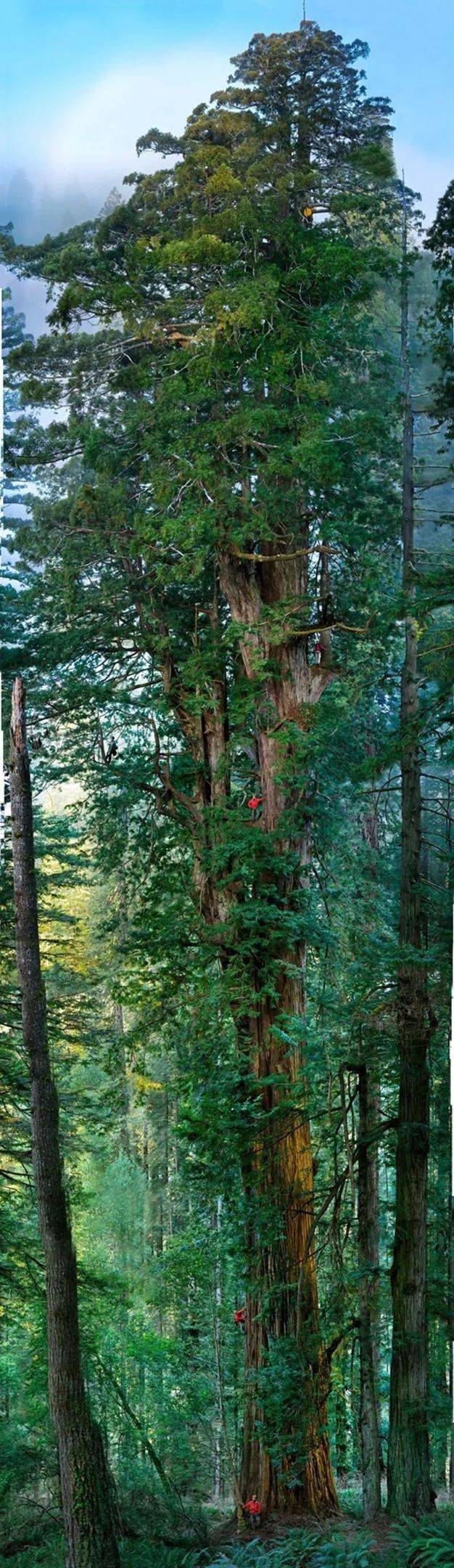 目前世界上的最高树木是位于美国加利福尼亚州红木国家公园的“亥伯龙神”树,这棵北美红杉高达115.92米,最早发现于2006年,之后被吉尼斯世界纪录认证为世界上最高的树木。下图为美国国家地理于2009年为这棵树拍的全身像: