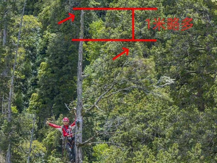 再者,从照片上看这棵树的顶端有枯枝,而第二次测量数据说的是树的活体高度,未知是否算上了枯枝的高度。