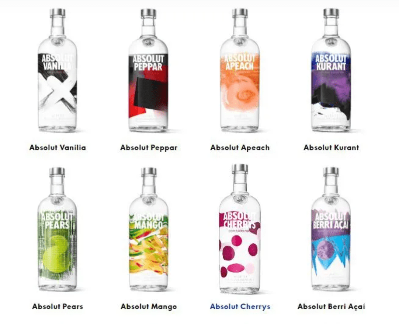 绝对伏特加不仅是第二大伏特加品牌,它的口味也在不断更新。从1980年代起,绝对伏特加家族不断扩大,陆续增加了辣椒、柠檬、黑加仑、柑橘、香草、红莓等多种口味,并依然保持了绝对伏特加的优异品质。