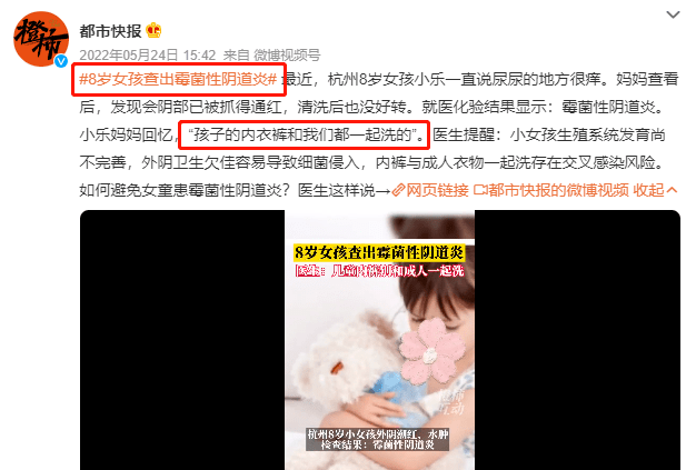 去年杭州一名8岁女孩查出霉菌性阴道炎,诱因很可能是内裤和大人的混洗。