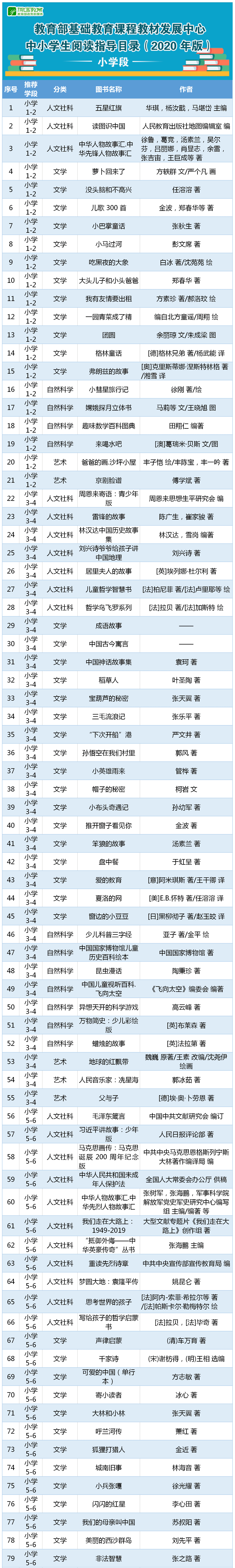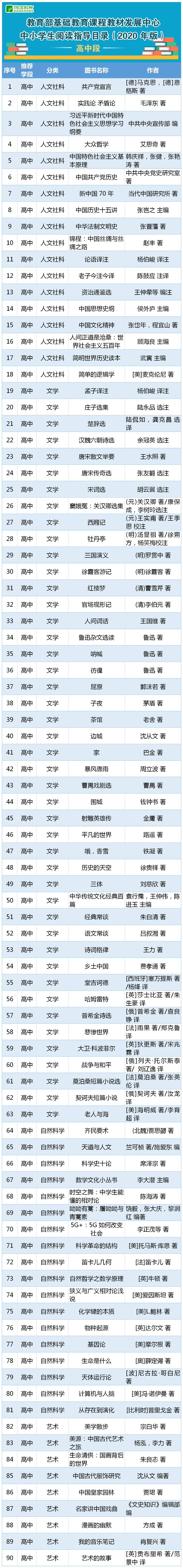 受教育部委托,教育部基础教育课程教材发展中心组织研制并发布了《教育部基础教育课程教材发展中心 中小学生阅读指导目录(2020年版)》,《指导目录》分为小学、初中、高中三个学段,推荐了各类图书。