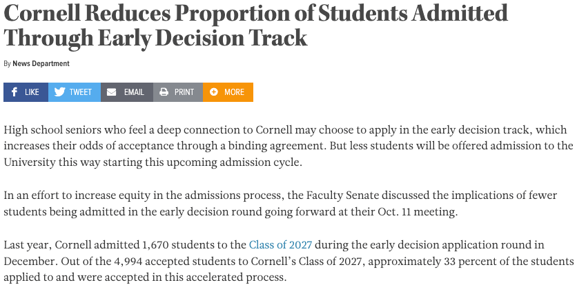 早前康奈尔为了提高招生过程的公平性,在10月的会议上讨论要适当减少早申的录取学生。这一消息流出的时候让不少心仪康奈尔的学生一度人心惶惶。