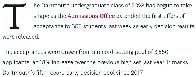 今年达特茅斯的从3550名申请者发出了606封录取,录取率相比于去年上升了18%。
