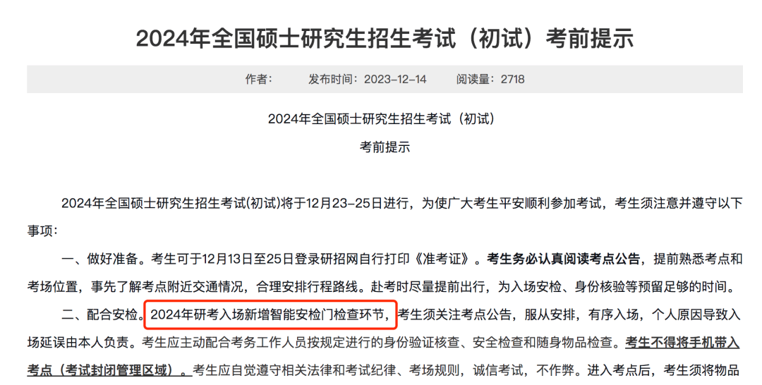 记者注意到,近日,多地发布2024考研须知。其中,黑龙江省、辽宁省、河南省等地明确,今年研考入场新增智能安检门检查环节。
