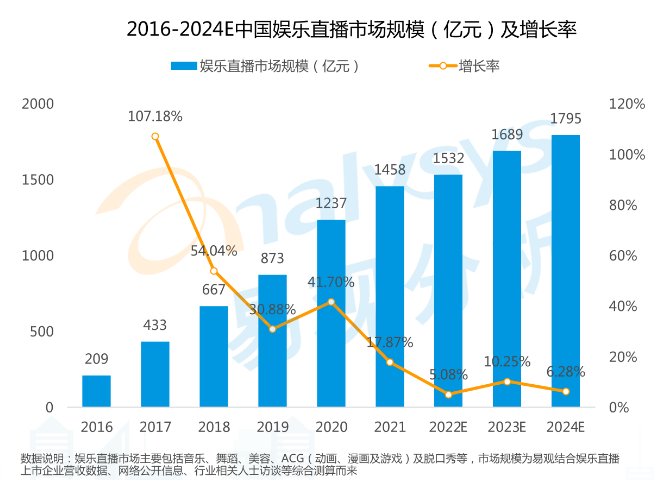 整体娱乐直播市场也难以保持高速增长。据易观预测,2018年-2023年中国娱乐直播市场规模复合增长率约为20%,增速从超过50%下降至去年的10%左右。