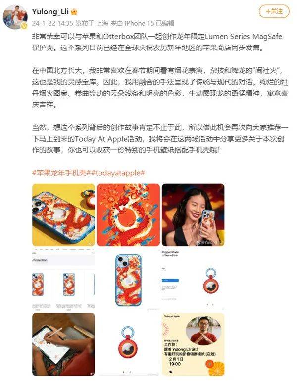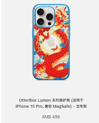 近日,苹果也在官网上架了全新龙年款手机壳,售价498元,适配iPhone 15系列。据了解,该系列手机壳出自常年为iPhone、iPad等苹果产品打造保护壳的厂家——OtterBox,由知名插画师 Yulong Lli 绘制。