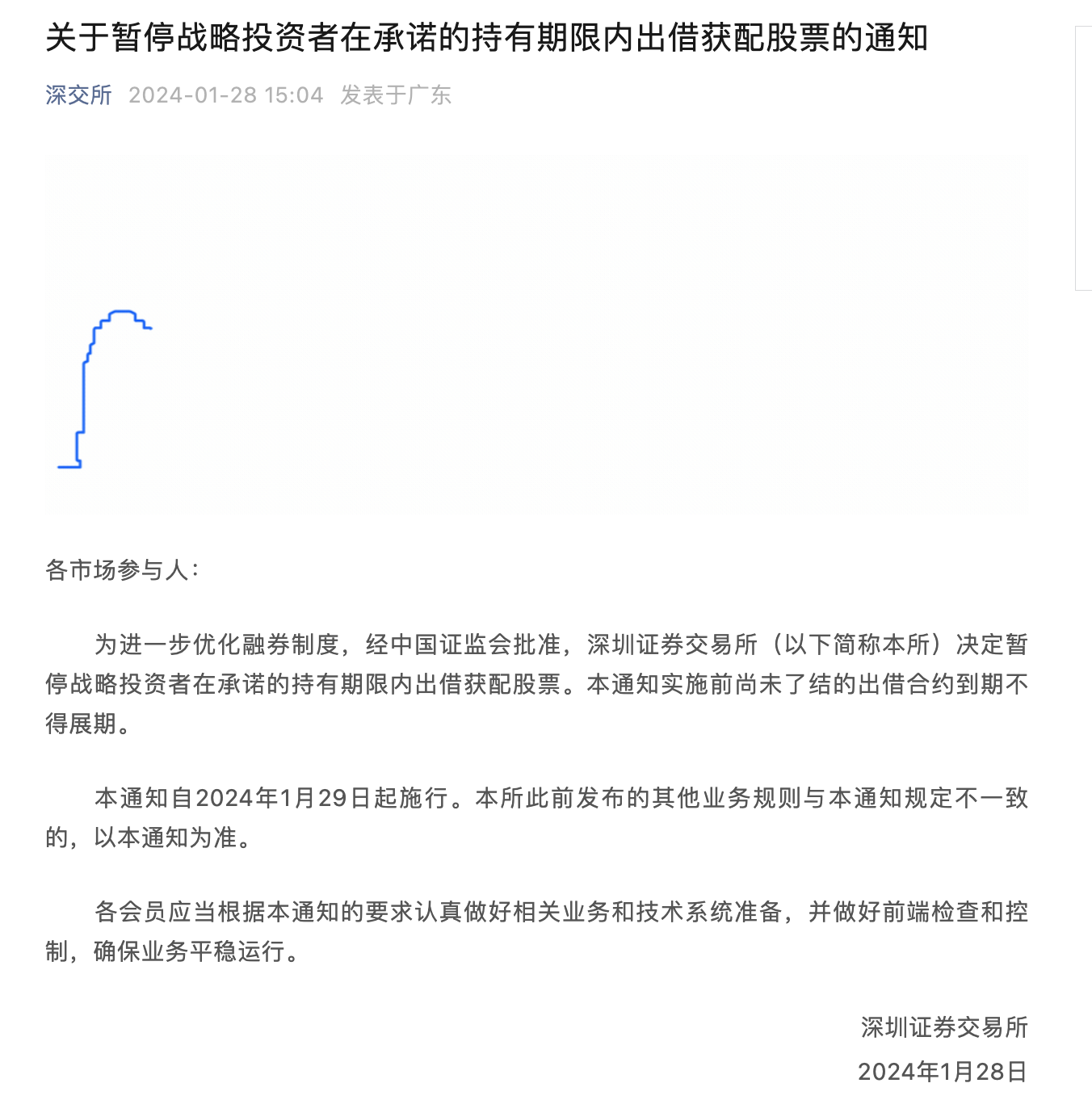 证监会1月28日消息,为贯彻以投资者为本的监管理念,加强对限售股出借的监管,证监会经充分论证评估,进一步优化了融券机制。具体包括:一是全面暂停限售股出借;二是将转融券市场化约定申报由实时可用调整为次日可用,对融券效率进行限制。因涉及系统调整等因素,第一项措施自1月29日起实施,第二项措施自3月18日起实施。