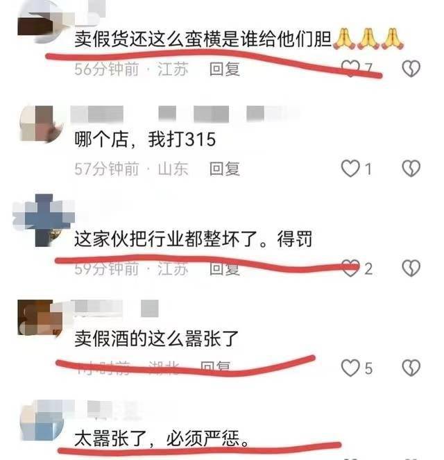 这段视频在短视频平台发布后,引发网友关注。网友纷纷留言:“这老板卖的是假酒吧,要不然为什么不给验”“卖假酒的这么嚣张了”“卖假货还这么蛮横,是谁给他们胆”“那今年315不得给他安排上啊”。