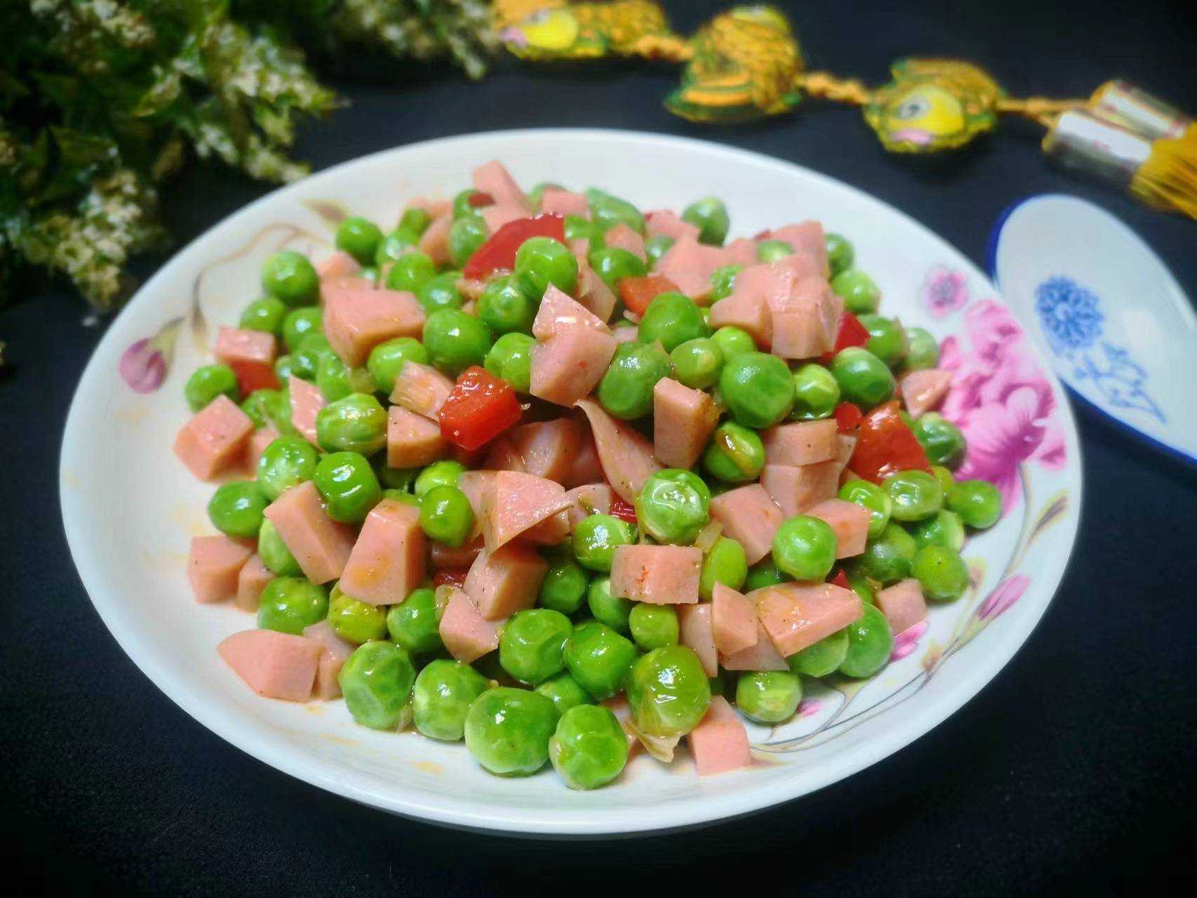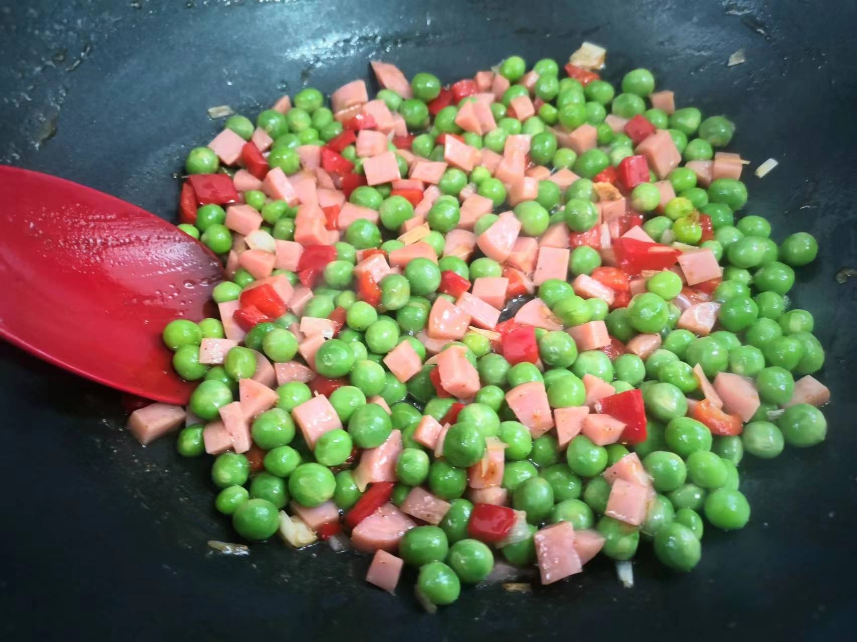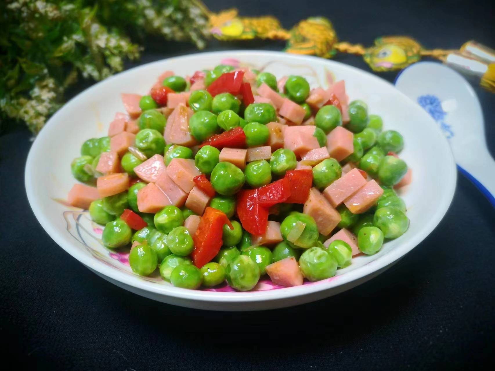 众所周知,现在正是吃豌豆的季节,豌豆特别鲜嫩,豌豆口感清甜,富含钙质、B族维生素、维生素C和胡萝卜素等。豌豆也是非常友好的一种蔬菜,豌豆可以清炒,可以水煮,可以用来做各种点心。前几天朋友送很多豌豆,一个个豆荚饱满,剥壳后的豌豆颗粒圆润,颜色鲜绿,看着很是让人喜爱。豌豆的做法有很多种,不过,如果想要下饭的话,把豌豆和火腿搭配一起炒最好吃,大家可以试试这样炒豌豆着吃,好看又好吃,做法还简单。而且豌豆与火腿的搭配,更加提高了蛋白质的吸收利用率。现在,我把这道“豌豆炒火腿”的家常菜做法分享给大家,祝朋友们身体健康!