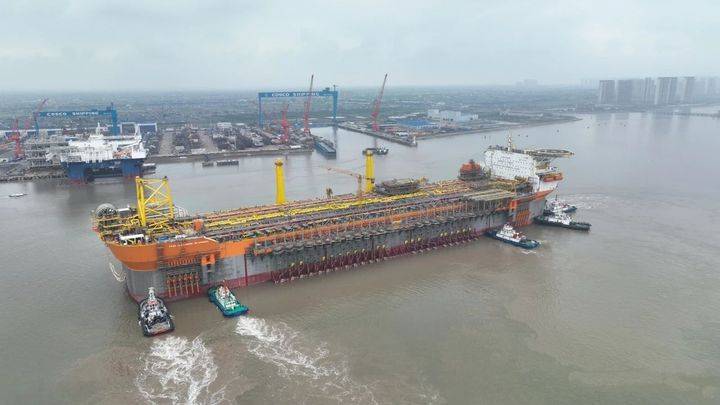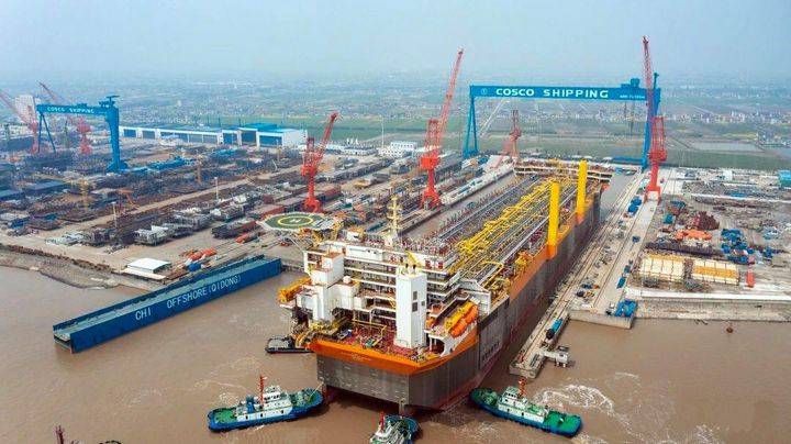 这艘世界最大吨位的FPSO船于7月1日在江苏启东中远海运码头顺利出坞。该船船体长335.31米,型长328.2米,型宽60米,相当于两个多足球场的面积,但是上面集中了各种化工装备,而且是多层分布,通常相当于一座陆地上的大型化工厂。