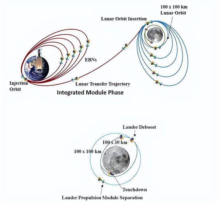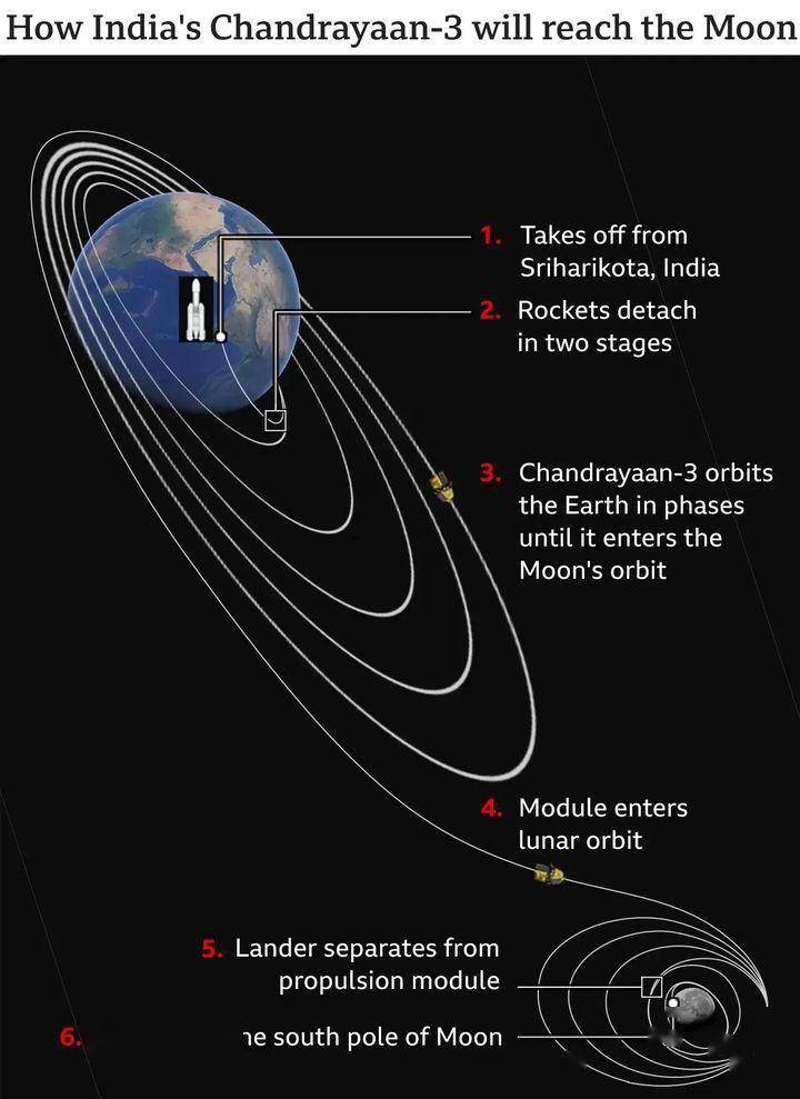 由于印度在卫星测控方面的技术能力不足,设备上有较大短板,印度的月船三号在发射之后的飞行测控大部分由美方负责,按照设定的飞行计划和轨道参数,月船三号需要围绕地球飞行5圈,利用地球的“引力弹弓”效应逐步加速并上升远地点,最终由远地点进入月球轨道。