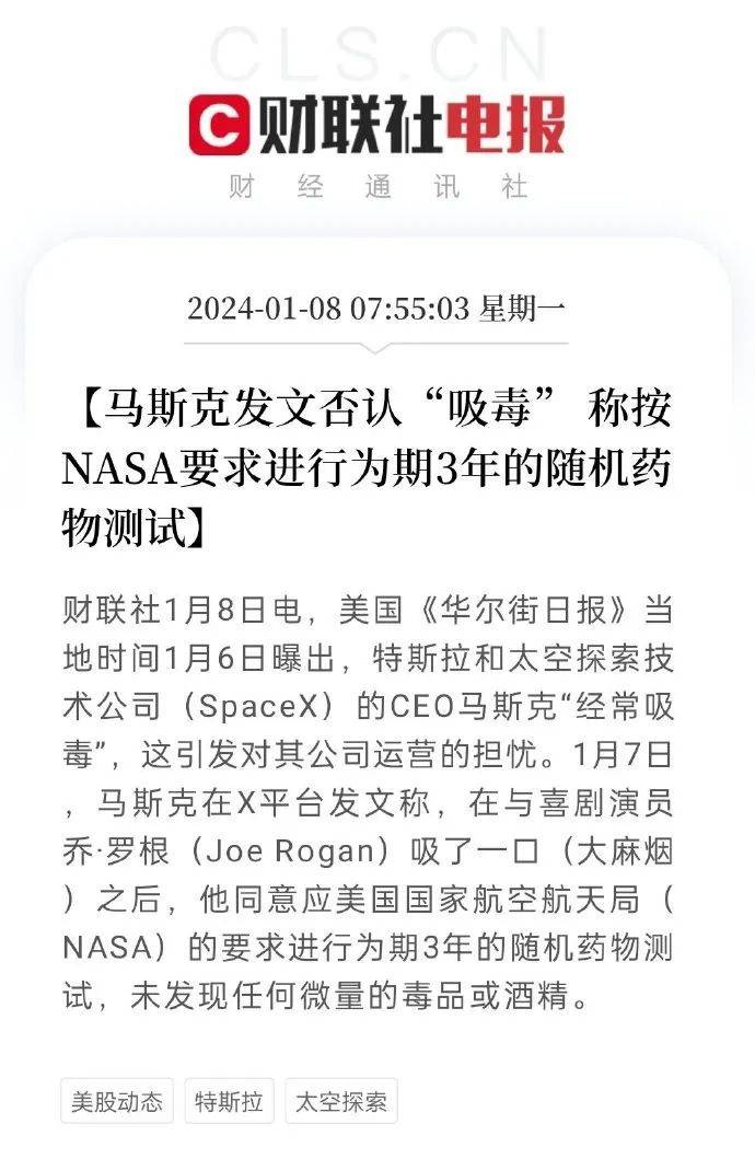 在美国《华尔街日报》曝出马斯克“经常吸毒”后,据财联社消息,1月7日,马斯克在X平台发文称,在与喜剧演员乔·罗根(Joe Rogan)吸了一口(大麻烟)之后,他同意应美国国家航空航天局(NASA)的要求进行为期3年的随机药物测试,未发现任何微量的毒品或酒精。