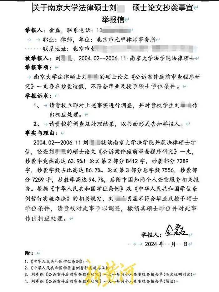 “我们此前接的一个案子在鹰潭中院审理,承办法官就是副院长刘某某,但是鹰潭中院不尊重我们的辩护权,跟我们说被告人已经找了法律援助律师,不需要我们。我们是被告家属请来的,现在法院来传话不需要我们代理,又不让我们见被告,我们该如何信服?”张庆方律师表示,因为之前在办案时就听过有法官论文抄袭的情况,于是就想查一下刘某某是否也存在这样的问题,之后就查到了她的个人毕业论文情况。“她是2006年从南京大学毕业的硕士,我找到了她的论文,查重过后发现论文抄袭率高达63.9%。好多人都说,一个学法学的学生,在学校里写论文都敢抄袭,将来当法官又怎么会公正执法?”